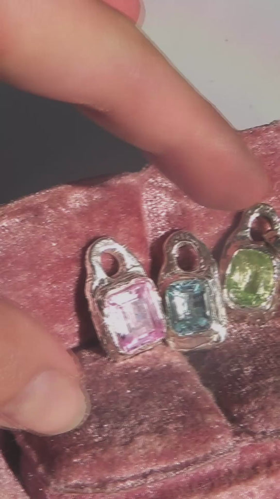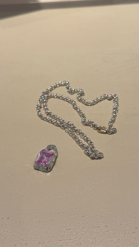 A chunky silver pendant with a candypink tourmaline or green peridot stone.