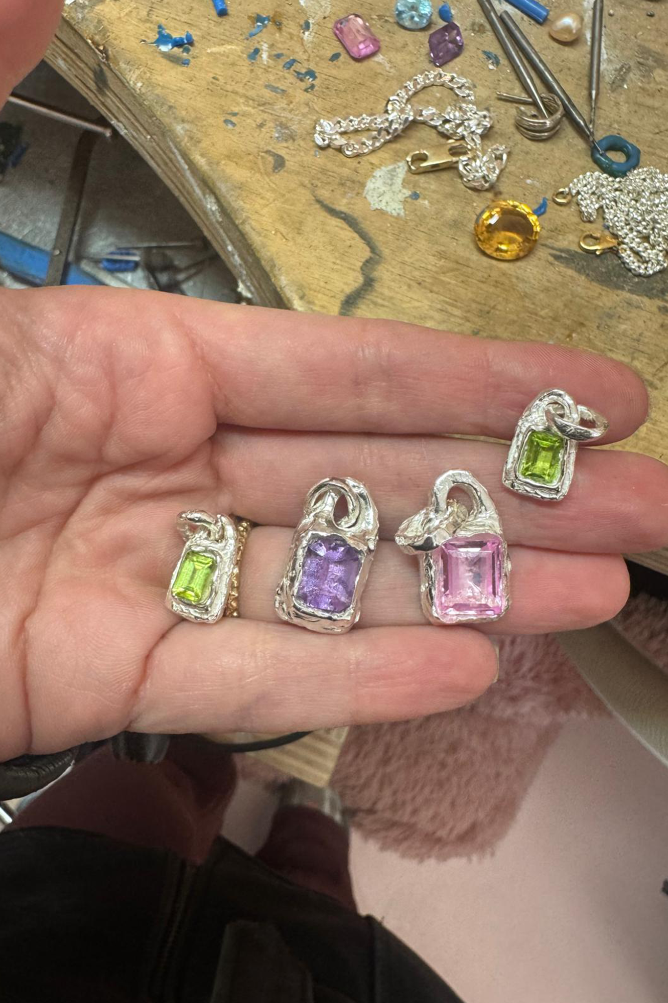 A chunky silver pendant with a candypink tourmaline or green peridot stone.