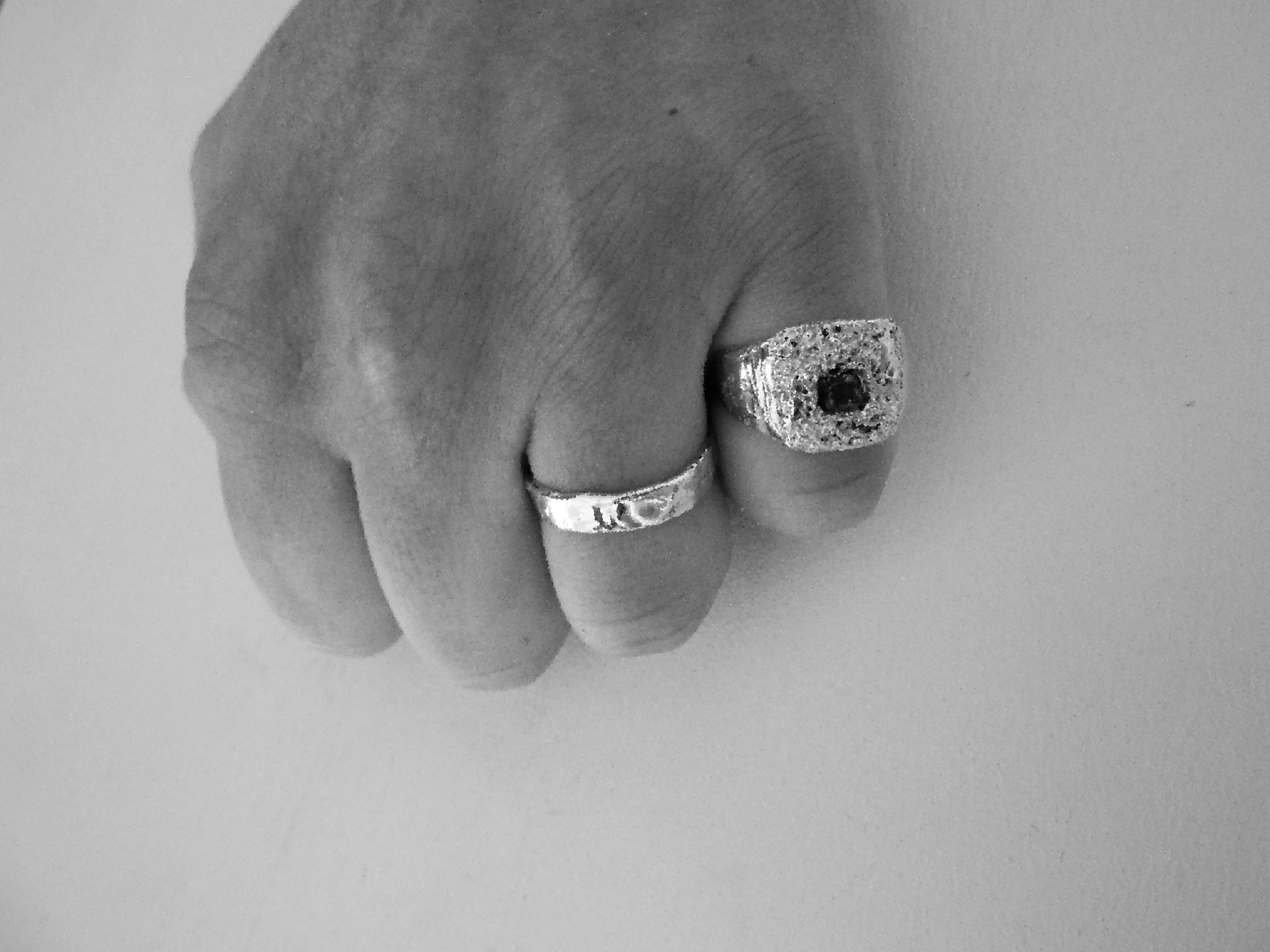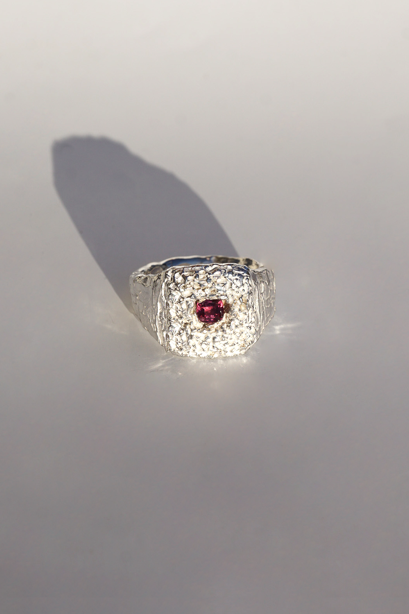 Introducing a new family member: Een handgemaakte zilveren signetring met een organische voorzijde, gezet met een prachtige rozerode rhodoliet granaat steen.