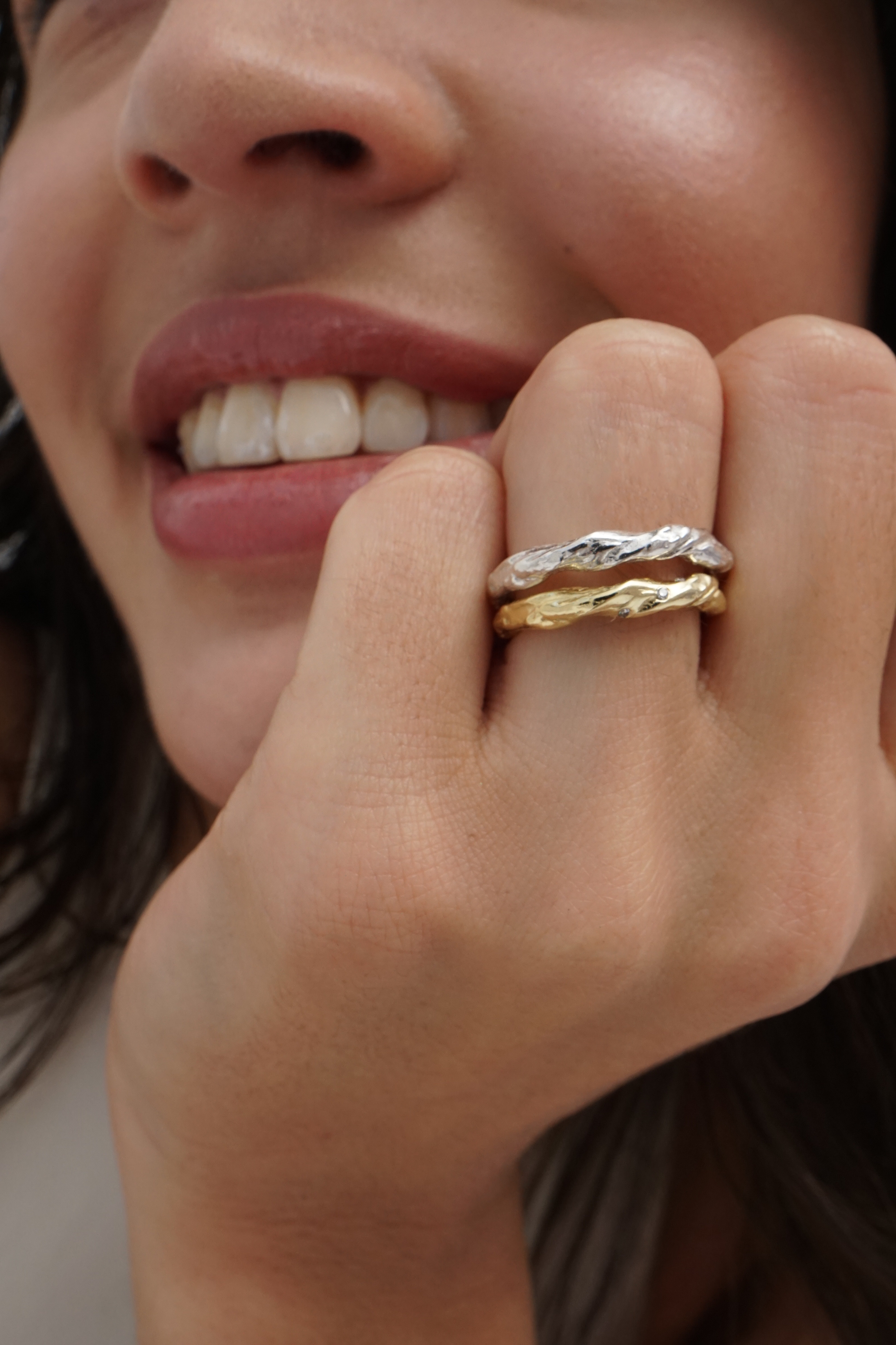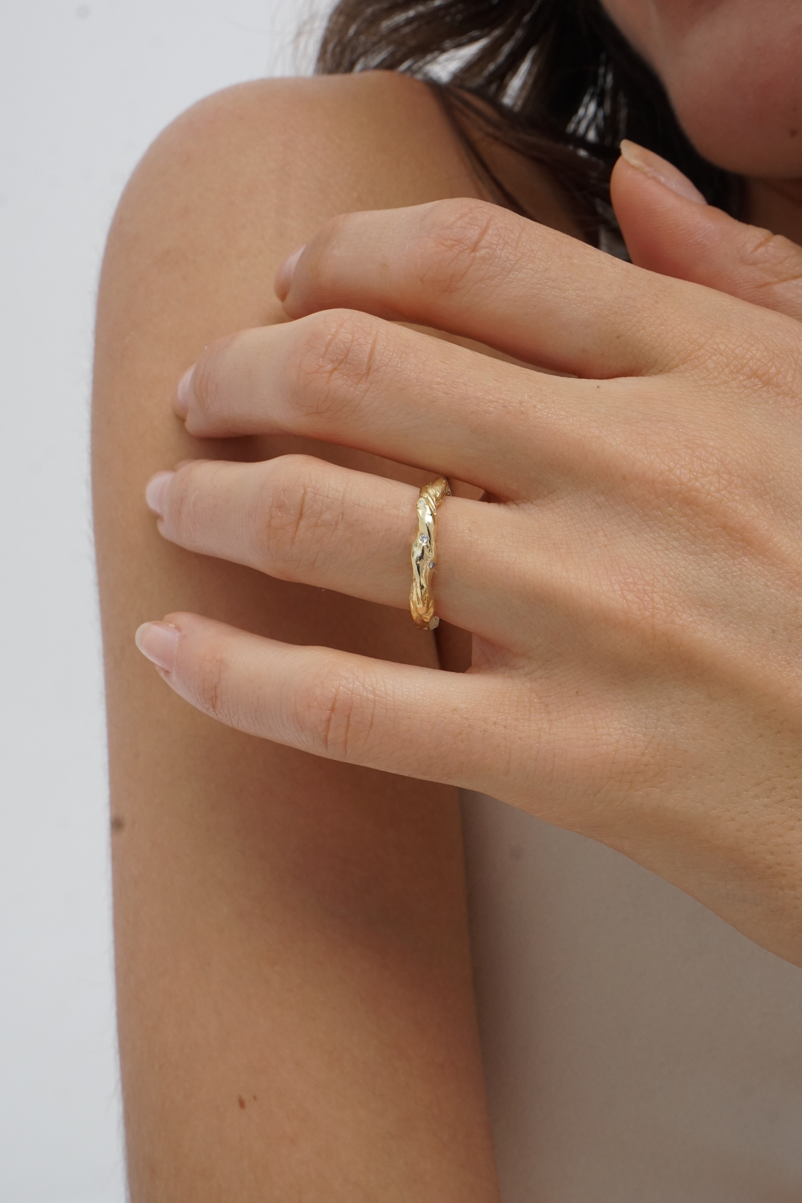 Een sculpturale ring van 14K geelgoud, gevormd door een zachte, natuurlijke draaiing. Perfect als verlovings of trouwring. Elk exemplaar wordt op maat ontworpen en met de hand vervaardigd in ons atelier in Rotterdam. Het ontwerp kan worden uitgevoerd met diamanten naar keuze, of volledig zonder.