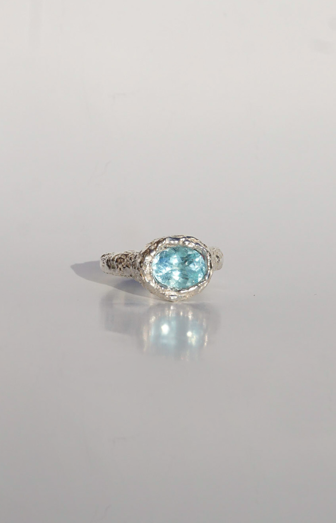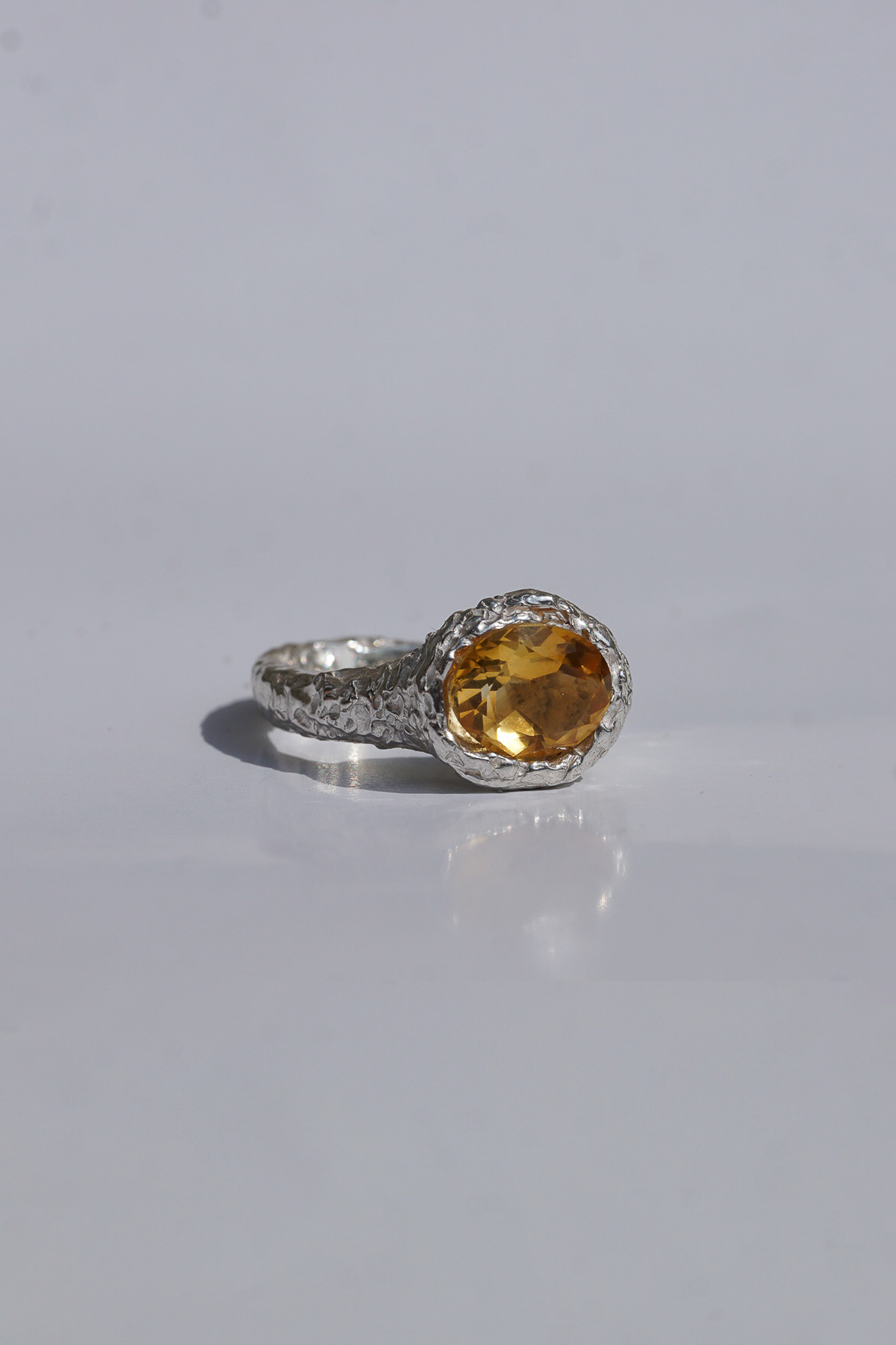 Een handgemaakte sculpturale sterling zilveren ring met een ovale edelsteen naar keuze. Handgemaakt in ons atelier in Rotterdam.