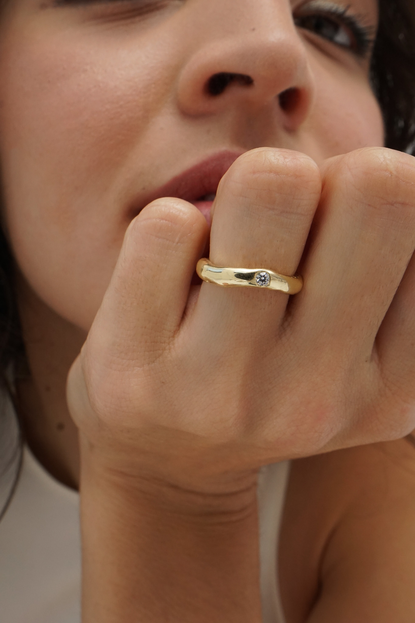 Een prachtige handgemaakte ring van 14 karaat geelgoud, gezet met een diamant. Perfect als verlovings- of trouwring. Elk sieraad wordt op maat ontworpen en met de hand gemaakt in ons atelier in Rotterdam.